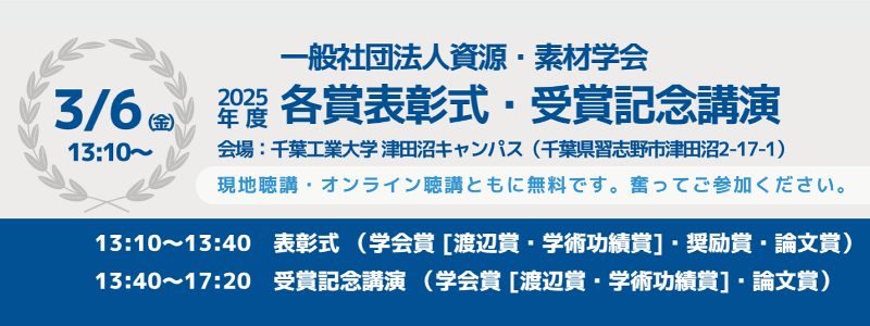 | 2026/01/07 | 学会 | 2025年度資源・素材学会表彰 各賞受賞者および表賞式の実施について |